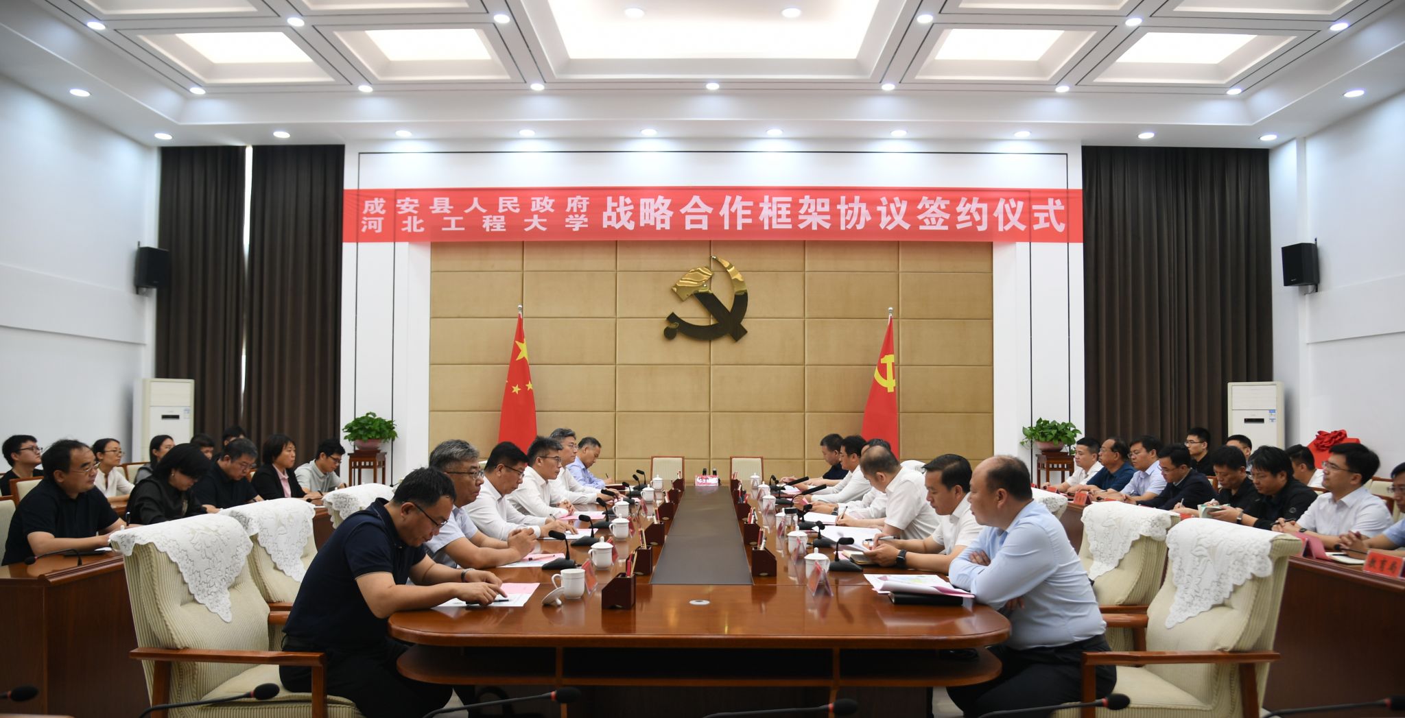 5月16日,安博电子与成安县人民政府战略合作框架协议签约仪式在成安县举行。学校党委书记于树江、成安县委书记李东健出席并讲话,党委副书记、校长单耀军与成安县委副书记、县长刘丙胜共同为“河北工程大学技术转移中心成安中心”揭牌,党委常委、副校长何立新与成安县副县长杨艳峰代表双方签署《成安县人民政府—河北工程大学战略合作框架协议》,县领导杨宽、程泉山、霍鸿河出席活动。