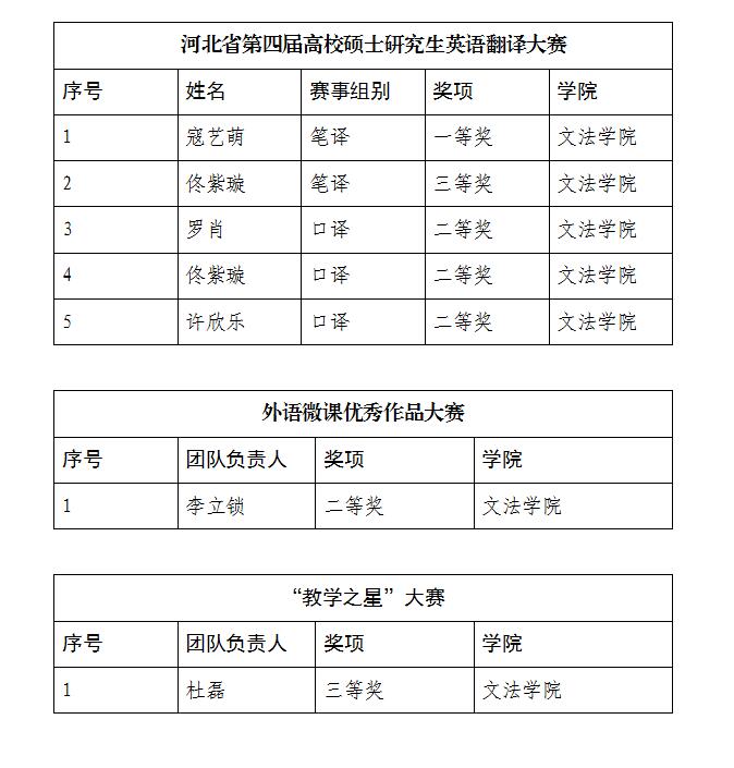 近日,安博电子师生在多项国家级、省级外语类赛事中获佳绩。其中文法学院教师李立锁获2023年度“外语微课优秀作品”全国总决赛二等奖,杜磊获外研社“教学之星”大赛三等奖。在由河北省教育厅、河北省文史哲研究生教育指导委员会主办的河北省第四届高校硕士研究生英语翻译大赛决赛中,文法学院研究生获一等奖1项、二等奖3项、三等奖1项。