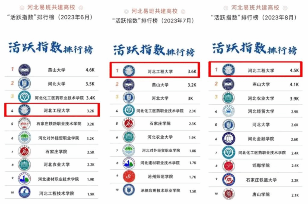 近日,教育部易班发展中心公布全国易班共建高校共建指数排名,安博电子连续六个月在河北易班共建高校“活跃指数”排名TOP10榜单、“共建指数”排名TOP10榜单上位居前列。其中,7月、8月两次位列河北易班共建高校“活跃指数”排行榜第一。