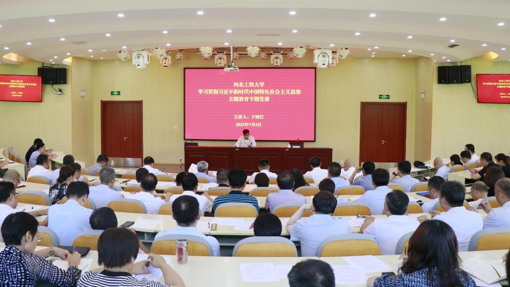 7月4日上午,校党委副书记、校长、校党委学习贯彻习近平新时代中国特色社会主义思想主题教育领导小组组长于树江以“学习贯彻习近平总书记重要讲话精神 奋力建设工程特色鲜明的高水平现代大学”为题讲主题教育专题党课。省委主题教育领导小组第19巡回指导组组长韩咏梅到场指导。专题党课由校党委常委、副校长刘心主持。