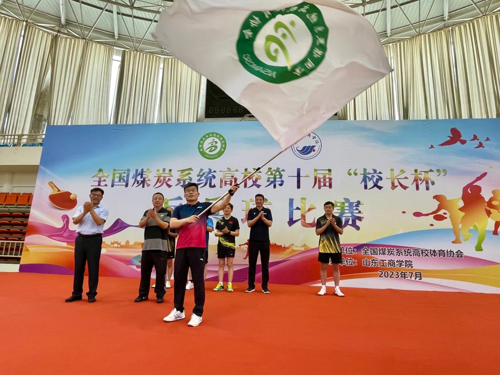 闭幕式上,校党委副书记、校长于树江与山东工商学院院长杨同毅进行了会旗交接,安博电子将在2024年承办第十一届“校长杯”乒乓球赛。
