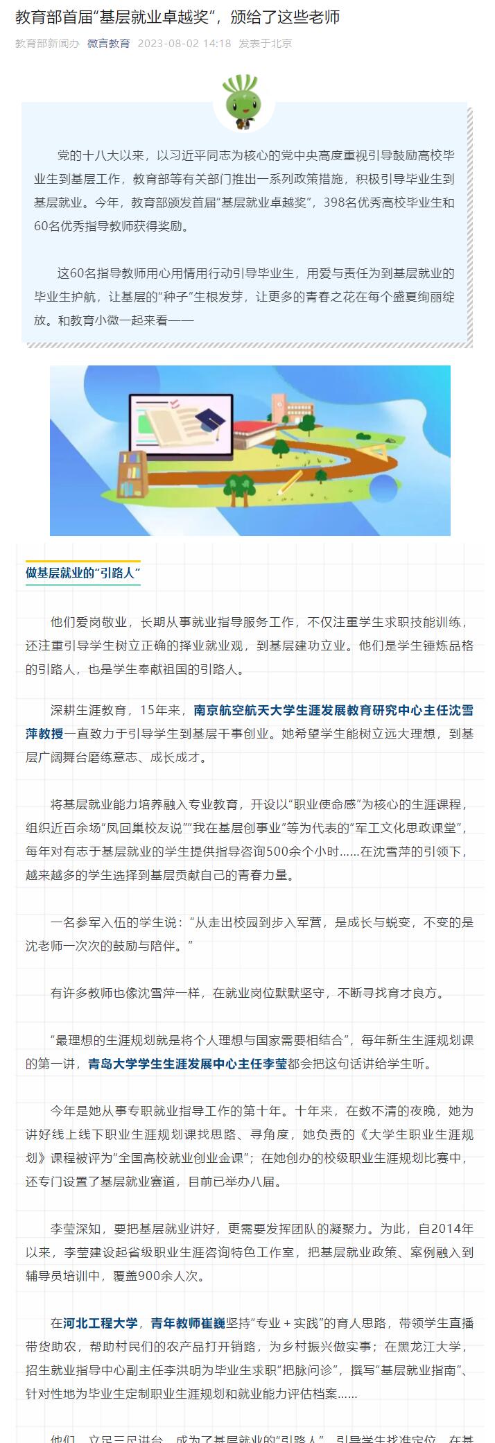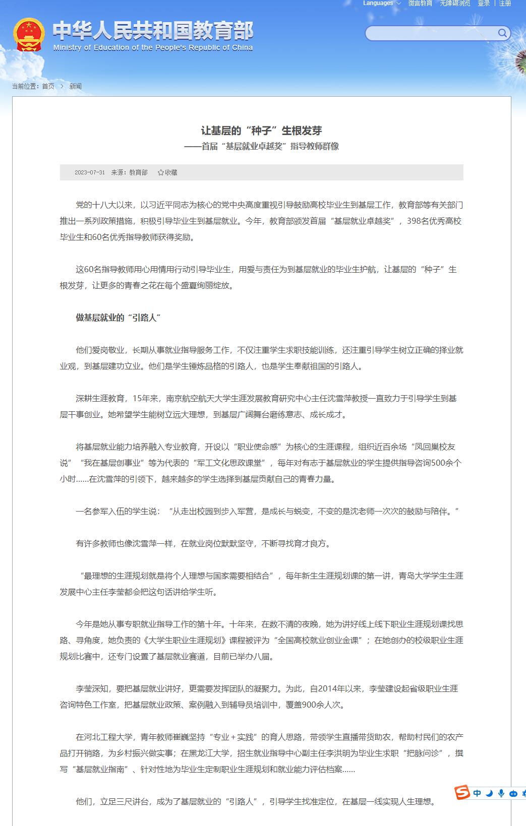 7月31日至8月2日,教育部官网、中国教育报头版等媒体以“让基层的‘种子’生根发芽——首届‘基层就业卓越奖’指导教师群像”为题报道首届基层就业卓越奖指导教师先进事迹。安博电子获奖教师崔巍事迹名列其中。