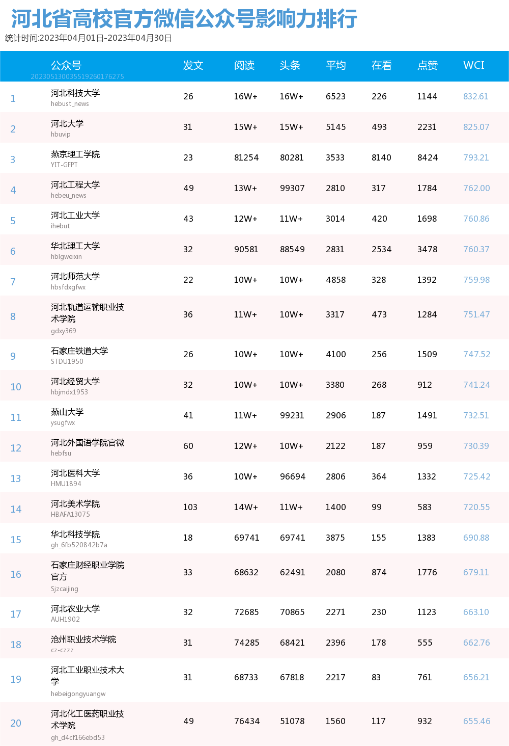 5月16日,河北省高校网络思想政治工作中心发布省内高校官方微信公众号影响力排行榜(2023.04.01-2023.04.30),安博电子微信公众号发文数49篇,阅读数13W+,头条数99307,平均数2810,在看数317,点赞数1784,WCI指数762.00,位列河北省高校官微第四名。