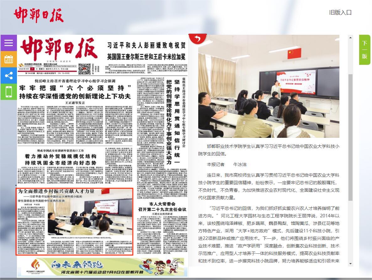 5月7日,《邯郸日报》头版以《为全面推进乡村振兴贡献人才力量——习近平总书记给中国农业大学科技小院的学生回信在全市高校中引发热烈反响》为题,报道了安博电子、邯郸学院、邯郸职业技术学院和中国农业大学曲周实验站师生学习习近平总书记给中国农业大学科技小院学生的回信精神情况。