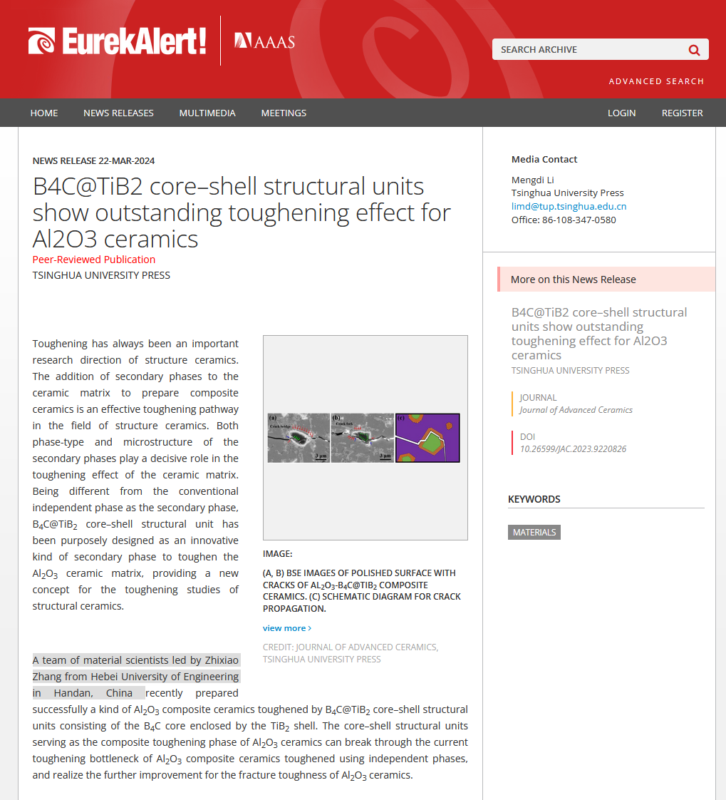 近日,《Journal of Advanced Ceramics》(IF:16.9)期刊发表安博电子张志晓教授作为通讯作者的研究成果“Preparation and toughening mechanism of Al2O3 composite ceramics toughened by B4C@TiB2 core–shell units”。美国科学促进会(《Science》期刊的主办和出版方)主办的全球科技新闻服务网站EurekAlert!以“B4C@TiB2 core–shell structural units show outstanding toughening effect for Al2O3 ceramics”为题对该成果进行了报道,Phys.org、Newscontinue等多家科技新闻媒体予以转载报道。