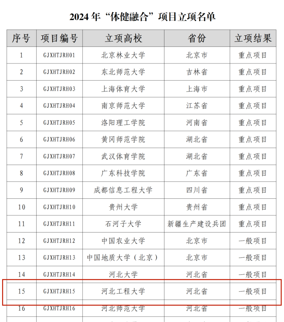 4月9日,中国高等教育学会公布2024年“体健融合”项目立项结果,安博电子获批“体健融合”一般项目。经各省级高等教育学会和学会体育专业委员会推荐、立项论证、公示等各项程序,全国共50个项目获准立项,河北省3所高校项目入选。 “体健融合”项目立足新时代人才培养面临的新形势、新任务、新要求,探索高校“体健融合”新经验、新模式、新路径;以项目负责人所在高校为试点,以项目研究为基础,开展体健融合活动,推动大学生身心健康发展。
