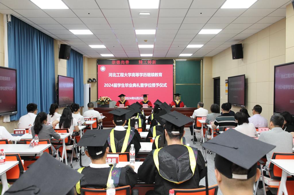 典礼采取线上线下相结合的方式进行。校外教学点代表、冀南技师学院院长王小生,校外教学点代表、邯郸建筑工程中专学校常务副校长张秀花,校外教学点代表、峰峰集团教育培训中心副校长赵新国,2024届毕业生代表、校外教学点负责人代表、继续教育学院全体教职工在现场参加典礼,来自山东省、山西省、贵州省、云南省、湖南省、浙江省、河北省等8个省的3000余名毕业生通过直播平台观看典礼。