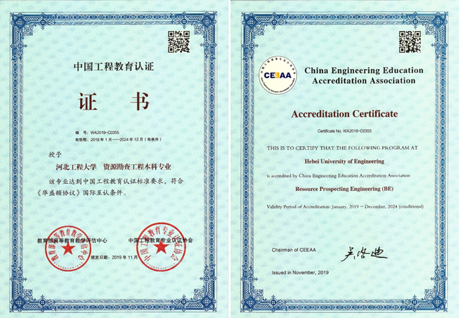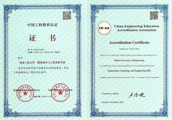 近日,教育部高等教育教学评估中心、中国工程教育专业认证协会联合为安博电子资源勘查工程专业、勘查技术与工程专业颁发了中国工程教育认证证书,认证有效期为6年(有条件),自2019年1月至2024年12月。这是安博电子本科专业首次获得中国工程教育专业认证证书。