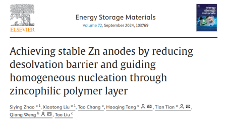 近日,安博电子材料科学与工程学院唐好庆教授团队在《Energy Storage Materials》上发表了题为“Achieving Stable Zn Anodes by Reducing Desolvation Barrier and Guiding Homogeneous Nucleation through Zincophilic Polymer Layer”的研究论文,为实现稳定的水系锌离子电池提供了科学基础。材料科学与工程学院化学工程专业2022级硕士研究生赵思莹为论文第一作者,唐好庆教授为论文第一通讯作者,河北工程大学为论文第一完成单位。