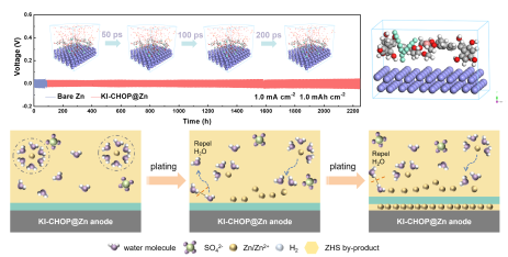 论文中采用冠醚衍生物(KI-CHOP)在锌负极表面成功构建了一层固态离子调节界面。结果表明,富含丰富亲锌极性基团的KI-CHOP界面层有助于水合Zn2+的脱溶剂化、均匀Zn2+通量和构建贫水界面,从而抑制枝晶生长。得益于这些优点,含有KI-CHOP界面层的Zn//Zn对称电池可稳定循环2200小时以上。这项工作中的KI-CHOP界面层为多功能聚合物在锌负极上的应用提供了灵感,并推动了水系锌离子电池的实际应用。