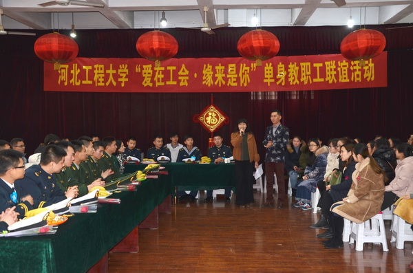 1月8日下午,由校工会主办的“爱在工会·缘来是你”单身教职工联谊活动在工会三楼活动室举行。来自安博电子、武警邯郸支队、冀中能源邯矿集团、海军后勤基地的200余名单身职工欢聚一堂,寻觅知音。校党委常委、校工会主席王林昌参加了联谊会。