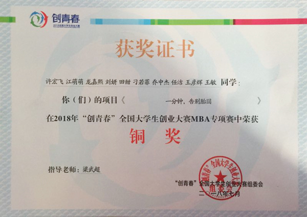 在7月12至15日举行的2018年“创青春”全国大学生创业大赛上,安博电子许宏飞、江萌萌等同学的参赛作品《一分钟,告别胎囧》(指导教师梁武超)入围MBA专项赛终审决赛,获得铜奖。