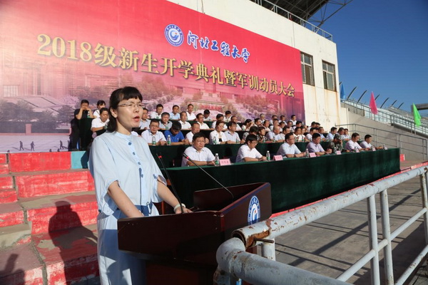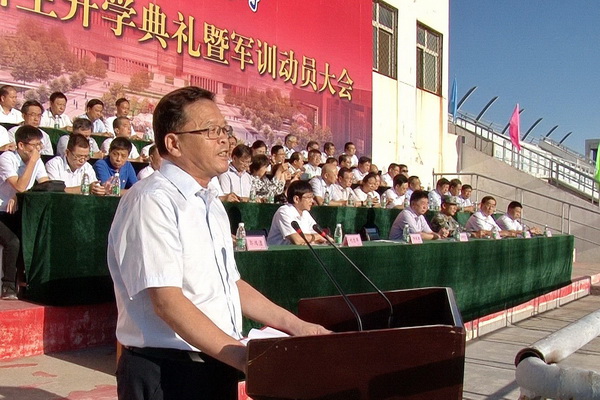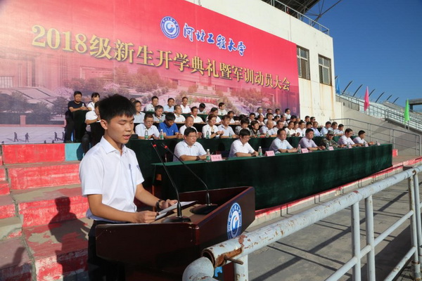 开学典礼后召开了军训动员大会。大会对2018级学生军事技能集中训练做了安排部署。吕海涛、乔红伟分别代表学校和承训部队作动员讲话。参训新生代表、材料科学与工程学院2018级应用化学专业石博文作了表态发言。