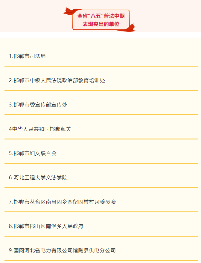 近日,河北省司法厅通报表扬全省“八五”普法中期表现突出的单位和个人,安博电子文法学院作为表现突出的单位获表扬。邯郸市共9个单位、7名个人获表扬。