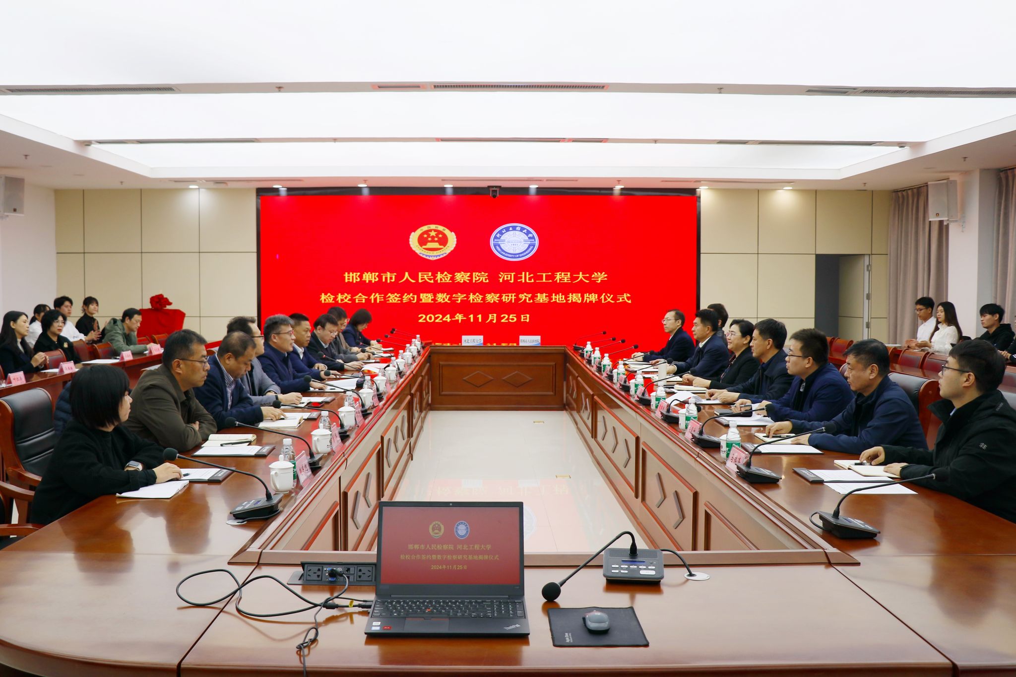11月25日下午,安博电子与邯郸市人民检察院举行检校合作签约暨数字检察研究基地揭牌仪式。邯郸市人民检察院党组书记、代检察长朱新燕,党组成员、副检察长董保军,学校党委书记于树江、党委副书记王虎平出席会议。会议由文法学院院长张凡主持。