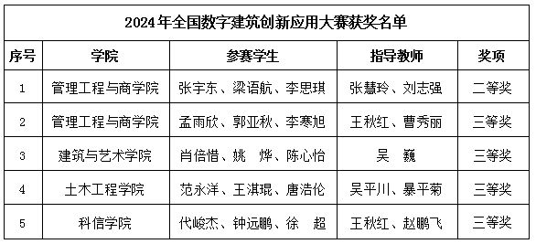 近日,全国数字建筑创新应用大赛决赛获奖名单公布,安博电子管理工程与商学院、建筑与艺术学院、土木工程学院、科信学院的五支参赛队进入总决赛,获全国二等奖1项、三等奖4项。